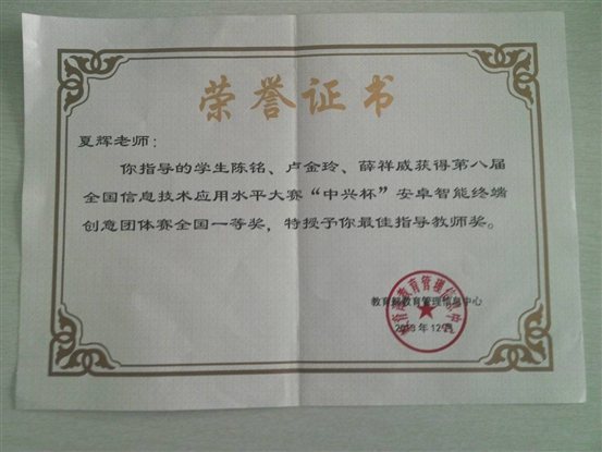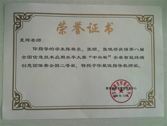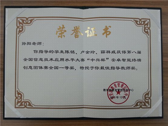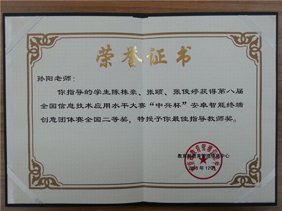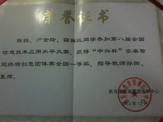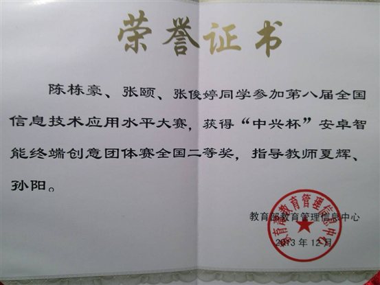 在12月9日结束的第八届全国信息技术应用水平大赛—“中兴杯”安卓智能终端创意大赛全国总决赛中,我公司由2010级网络工程和软件工程专业6名员工组成的两个十大正规买足球网站代表队经过激烈角逐,最终荣获安卓智能终端创意大赛团体赛一个全国一等奖和一个全国二等奖。公司孙阳、夏辉老师被授予“最佳指导教师”称号。