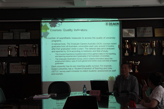 本次讲座的题目是“Australian Universities”。周教授重点讲解了澳大利亚的大学的管理机构、教育机构、学术委员会、大学课程质量。周教授介绍澳大利亚是一个非常重视教育的国家,每一个大学都有校董事会和学术委员会组成,国家和公司每年都会进行一次小的评估,每五年都对大学进行一次大评估,以对教学的发展进行预测与评估。大学十分重视教学的质量,员工对自己所学科目都能给予客观评价。在员工就业上,即将毕业的老员工需通过本专业类型的委员会认证才能就业。