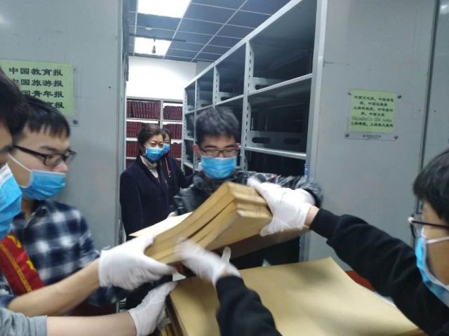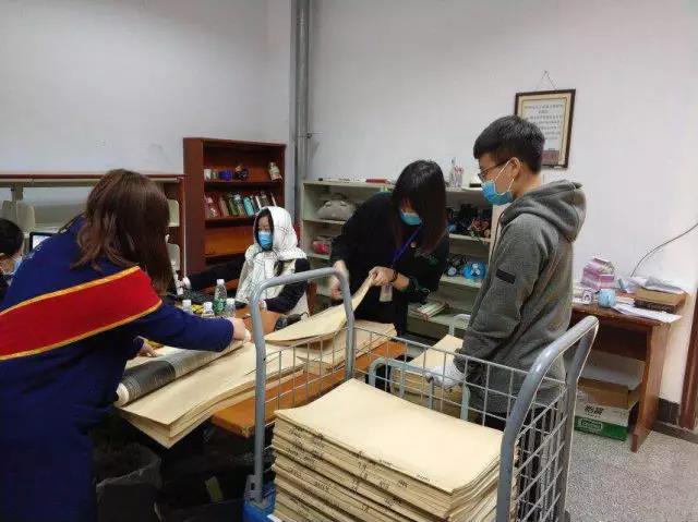 活动现场的图书储物间一个个佩戴绶带,胸别星手标的的志愿者们,穿梭于书架间,归置书籍。此外,愿者们还帮助管理员老师重新整理报纸,进行报纸的再次登记、运送、并将报纸的分类摆放到书架上进行保存。