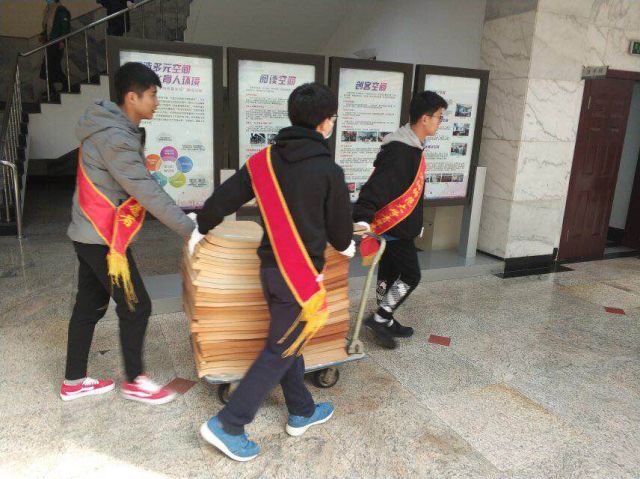 志愿者们辛苦搬运书籍