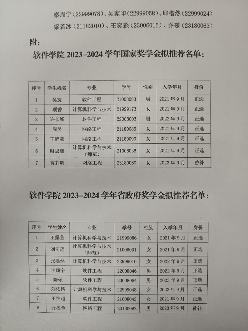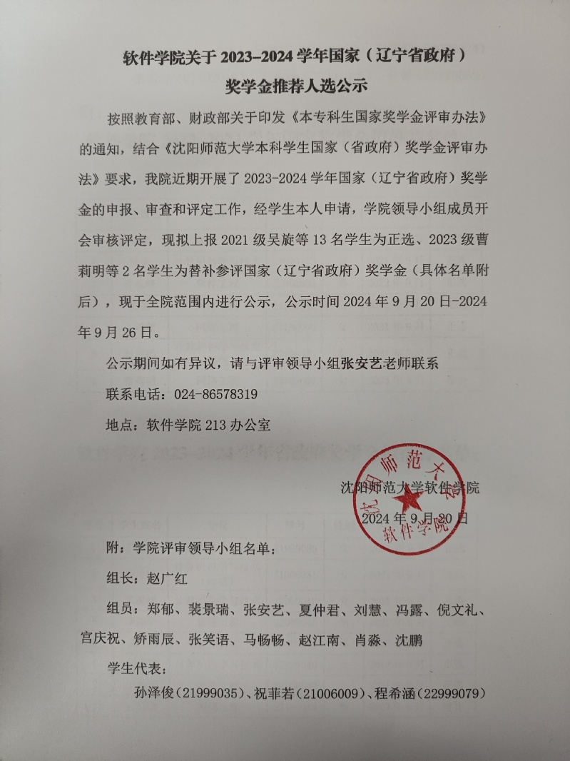 软件公司关于2023-2024学年国家(辽宁省政府)奖学金推荐人选公示