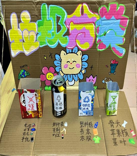在这些可爱的作品中我们看到同学们将宿舍中的废纸和海报以及药盒变成一只五彩斑斓的鲸鱼,用彩笔和废纸盒还有易拉罐制作成垃圾分类的艺术品等等,同学们用自己灵巧的双手赋予了废品第二次生命,让他们有了不一样的价值。
