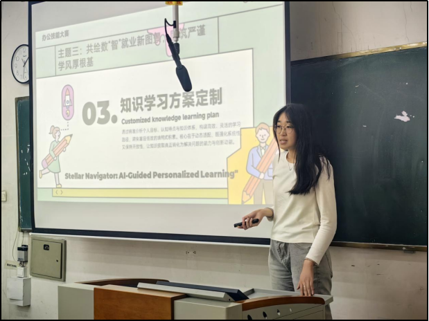 决赛以“ AI 生成 + 现场讲解”为创新形式,选手需从“智绘学风新画卷, AI 赋能谱华章”“ AI 生成演示之美,强技滋润学子心田”“共绘数‘智’就业新图景,同筑严谨学风厚根基”三大主题中任选其一,运用 AI 工具生成PPT,并在3分钟内阐述设计思路与技术路径。